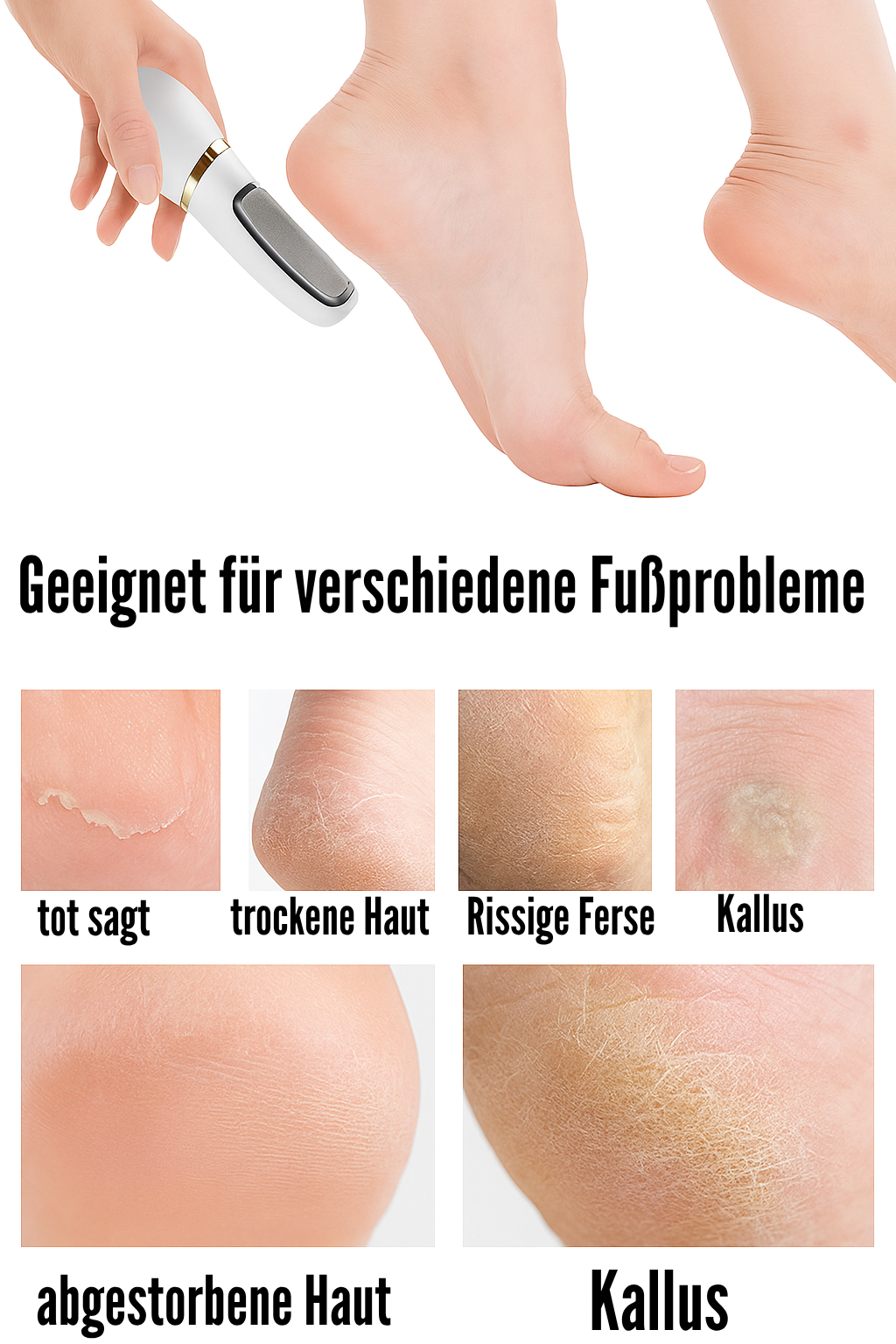 Haut. Der Effekt ist besonders deutlich spürbar, wenn er nach dem Duschen auf die aufgeweichte Haut aufgetragen wird. Er ist auch für die trockene Anwendung geeignet. Im Lieferumfang sind ein Ersatzkopf und eine Reinigungsbürste enthalten. Dank seiner Wasserfestigkeit ist die Reinigung einfach und mühelos. Es ist ein kleines, aber leistungsstarkes Gerät, ein Muss für jedes Zuhause. Wenn Sie mühelos glatte Fersen haben möchten, ist dies das richtige Gerät für Sie.